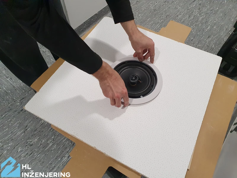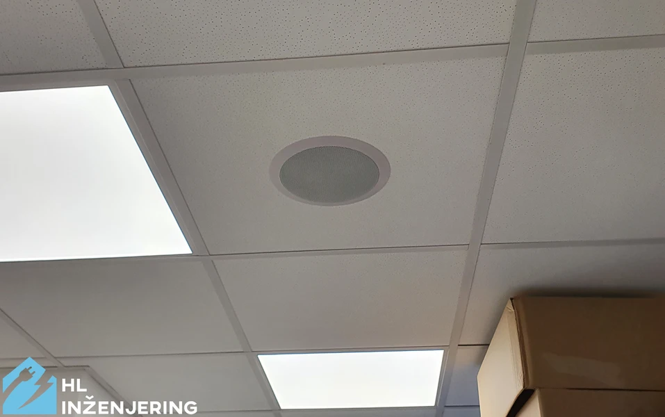 U ovom projektu smo izvršili ugradnju 4 stropna zvučnika diskretno pozicionirana u Armstrong plafon. Prednosti ovog sustava su praktični nevidljiva instalacija. Snaga zvučnika s obzirom na potrebe je zadovoljavajuća. Mrežica i okvir se mogu prilagoditi bojanjem ako je potrebno. Zvučnici se spajanju na centralno pojačalo koje u potpunosti kontrolira zvuk, moguća je zonska kontrola svakog pojedinačnog zvučnika ili više njih u istoj zoni. Najčešće instalacije ovakvog tipa su trgovine, caffe barovi, teretane, čekaonice itd. Ugradnja audio sustava za veće objekte je najčešće u 110 V varijanti, dok za manje sustave može se odraditi i ohmski.