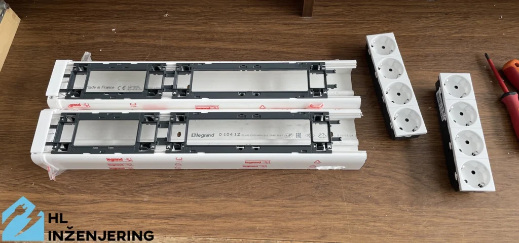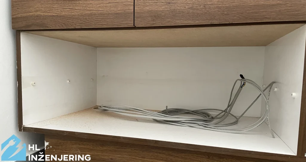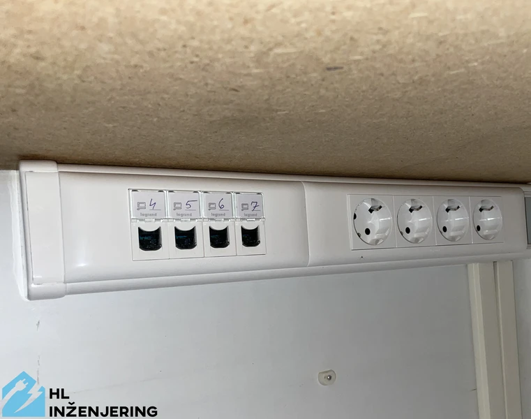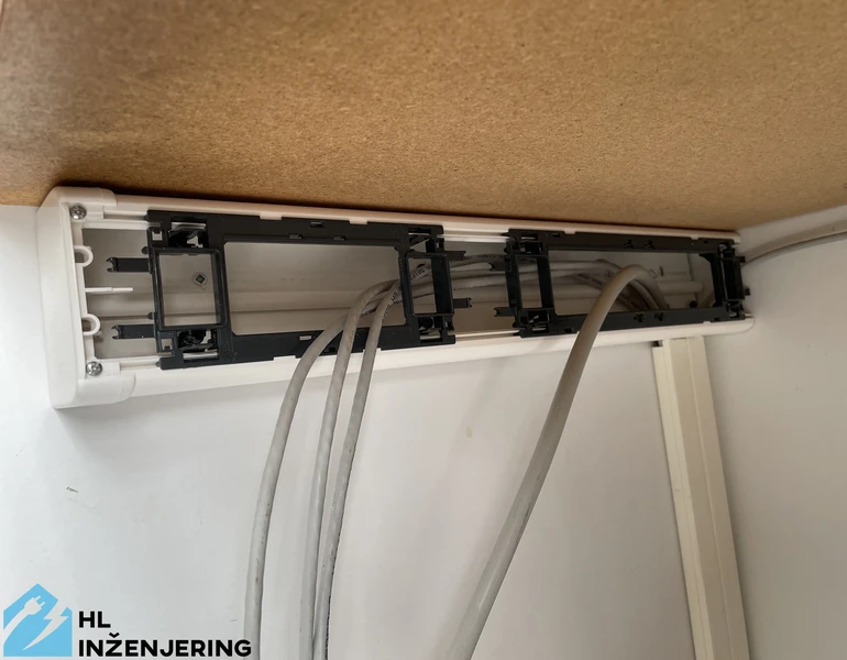 Prije same ugradnje instalacijskog kanala postavljeni su kabeli( strujni i mrežni) ispod glazure i pločica prema projektu. Svako radno mjesto je izvedeno s 4x RJ45 konektora i 4x šuko priključka. RJ45 priključnice su povezane s komunikacijskim ormarom. Sva distribucija mreže kreće iz komunikacijskog ormara. Radno mjesto je pripremljeno za računalo i popratnu opremu poput POS printera, MFP printera, telefona itd..